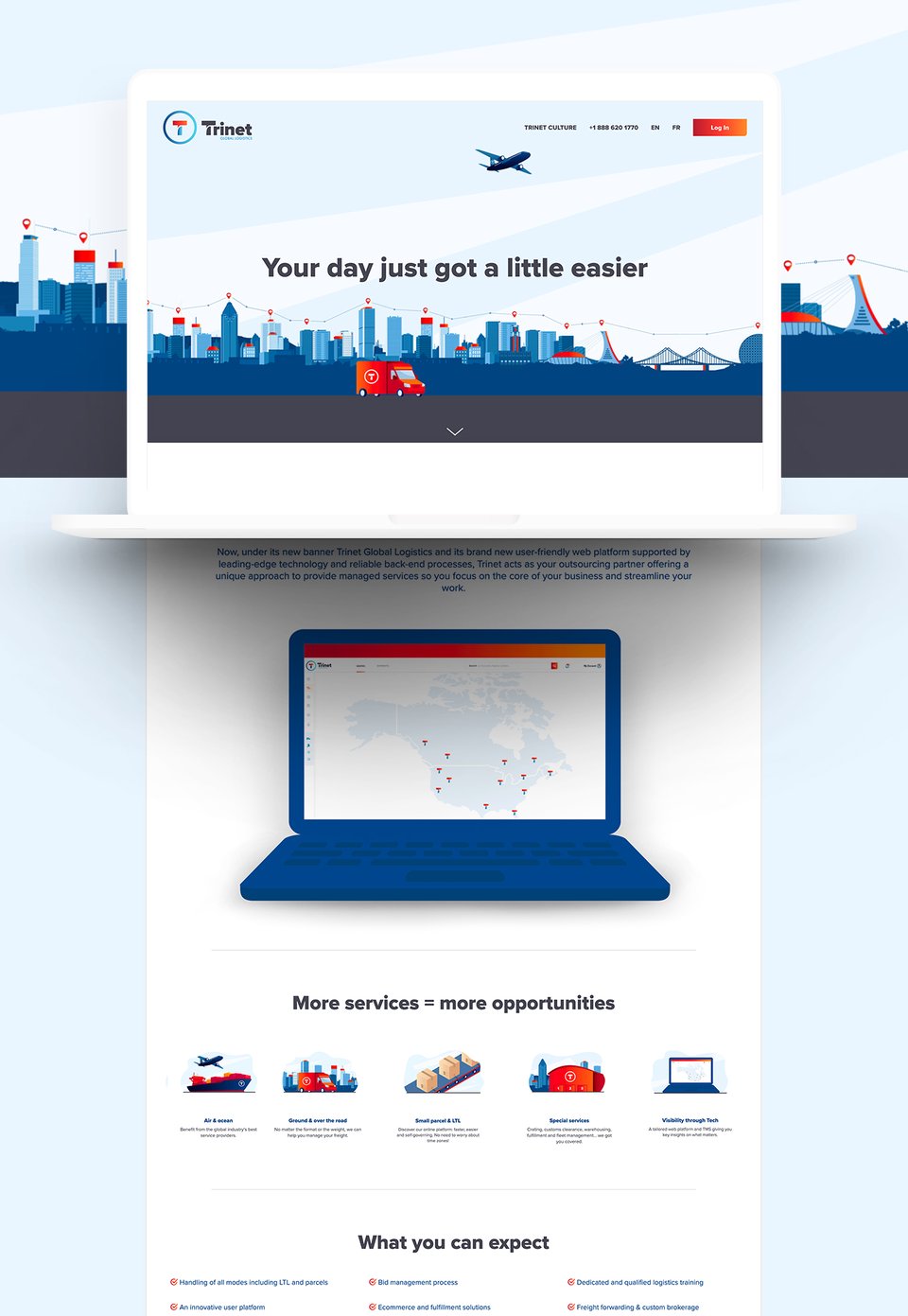 We designed Trinet's web mockups with the user experience placed at the heart of the process. The site had to meet the needs of two distinct audiences: companies looking for reliable logistics solutions and candidates wishing to join a growing team. This dual approach guided the structure, navigation, and design, ensuring a smooth and consistent experience for either journey. Our team then developed and hosted the website securely, guaranteeing both performance and stability. The digital ecosystem was strengthened by a search engine optimization (SEO) strategy, in addition to multi-channel advertising campaigns, aimed at increasing Trinet's visibility both among its potential customers and among the talent the company wishes to attract.