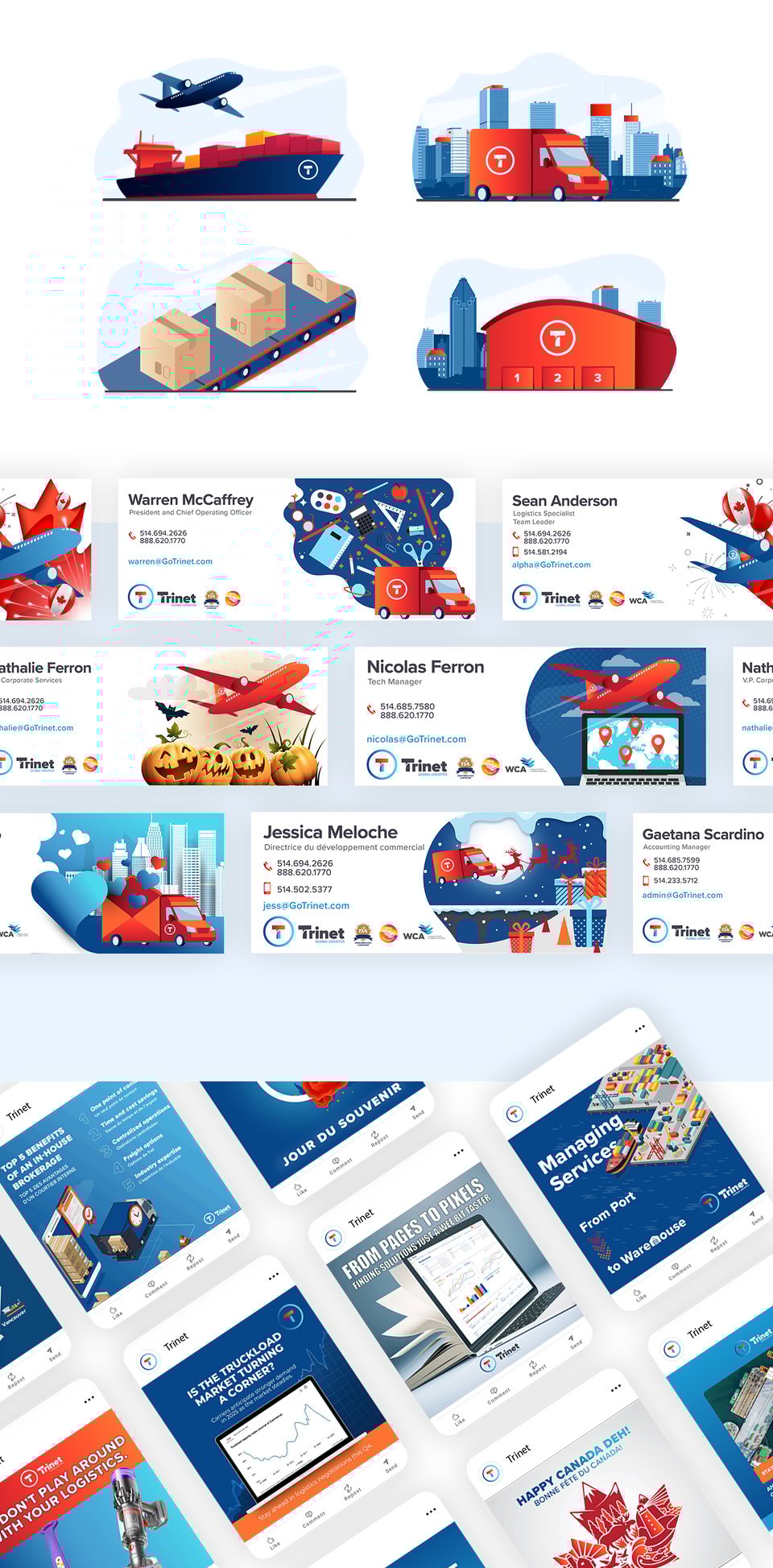 Nous avons entièrement conçu l’univers de marque de Trinet, de la plateforme visuelle à la création des illustrations et des images associées. L’objectif était de traduire la rigueur et la fiabilité du secteur logistique à travers une identité distinctive et cohérente. Cette identité a ensuite été déclinée dans l’ensemble de l’écosystème de communication de l’entreprise : site Web, signatures électroniques thématiques selon les saisons, publications sur les réseaux sociaux, ainsi qu'au sein de divers outils de communication internes et externes destinés au marché B2B.