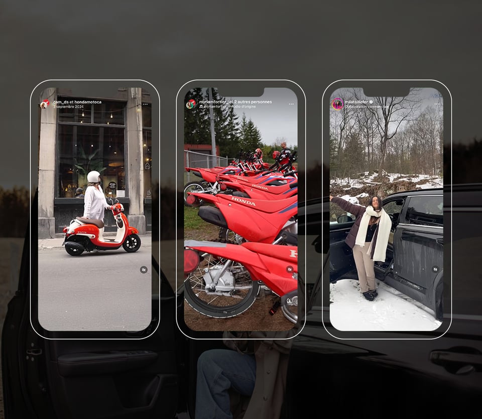 Nous mettons également en place des campagnes d’influence stratégiques pour accroître la notoriété de produits phares de Honda auprès des consommateurs québécois. Ceux-ci comprennent le CR-V Hybride, le scooter Giorno et les motos CRF, entre autres modèles.