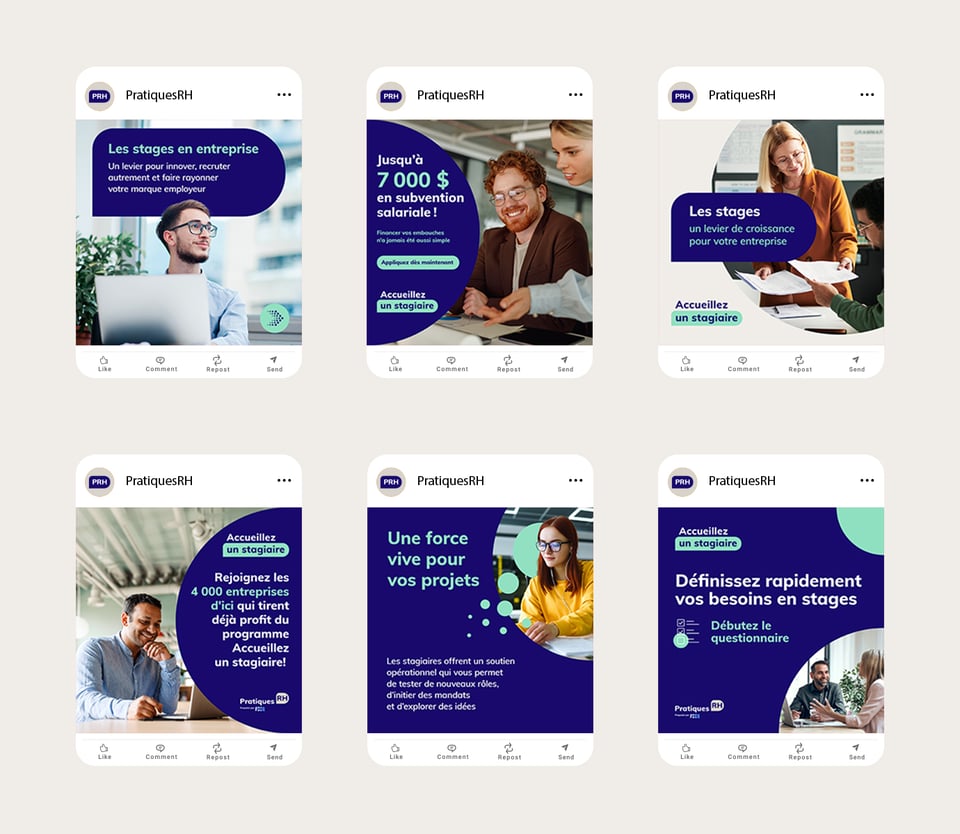 Dans un contexte de rareté de main-d’œuvre, la FCCQ nous a confié le mandat de concevoir l’identité visuelle et le déploiement communicationnel du programme Accueillez un stagiaire. Dès le départ, nous avons développé une identité distinctive et cohérente avec la plateforme Pratiques RH, puis défini un positionnement clair, soutenu par des messages clés adaptés aux PME et microentreprises. Cette approche visait à mettre en valeur les bénéfices concrets du programme et à éviter toute confusion quant à son objectif principal : l’accès à des subventions salariales pour l’accueil de stagiaires.