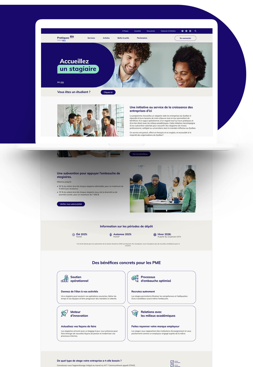 Notre équipe a accompagné la FCCQ dans le lancement du programme Accueillez un stagiaire, une initiative de Pratiques RH offrant 4 000 subventions salariales totalisant 30 M$ pour soutenir les PME québécoises. Notre mandat : concevoir l'identité du programme, créer une plateforme en ligne facilitant la gestion des demandes et déployer une stratégie multicanale pour maximiser le rayonnement auprès des entreprises de toutes les régions.